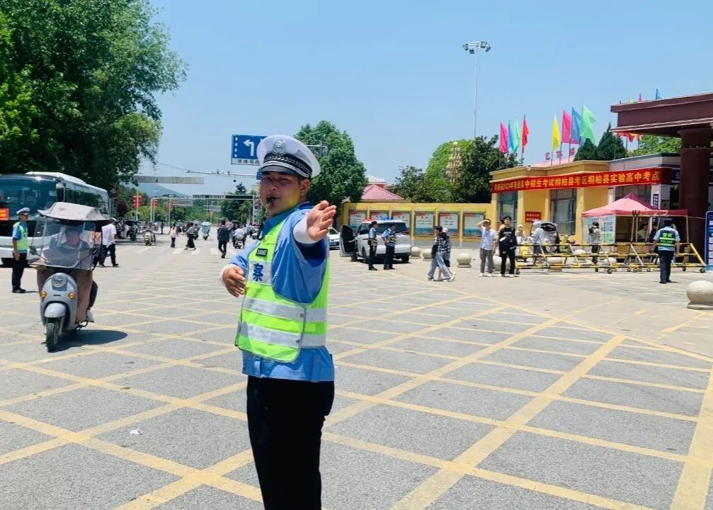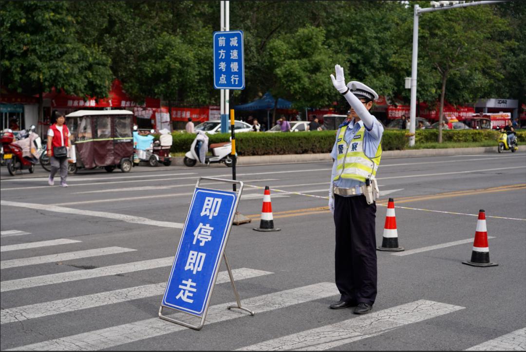 ▲濮阳交警在考点严阵以待,随时处置考生的应急需求。“一路上都能看到警察的身影,
