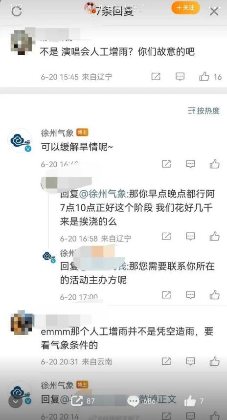 记者查看徐州气象官方微博发现,从6月21日开始,多条微博下面的评论数量骤增,留言数已达上千条,远高于平时正常留言量。