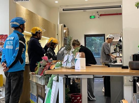 等到了10点,这家独立咖啡馆的外卖进入一个小高峰,最多的时候,店内同时来了4名外卖骑手。