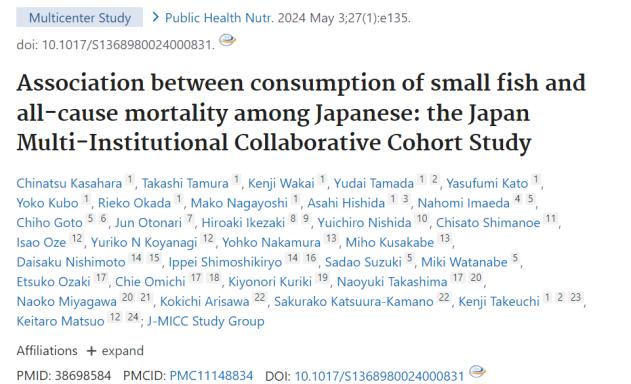近日,日本名古屋大学的研究人员在《Public Health Nutrition》期刊上发表了一篇引人注目的研究,名为“Association between consumption of small fish and all-cause mortality among Japanese: the Japan Multi-Institutional Collaborative Cohort Study”。