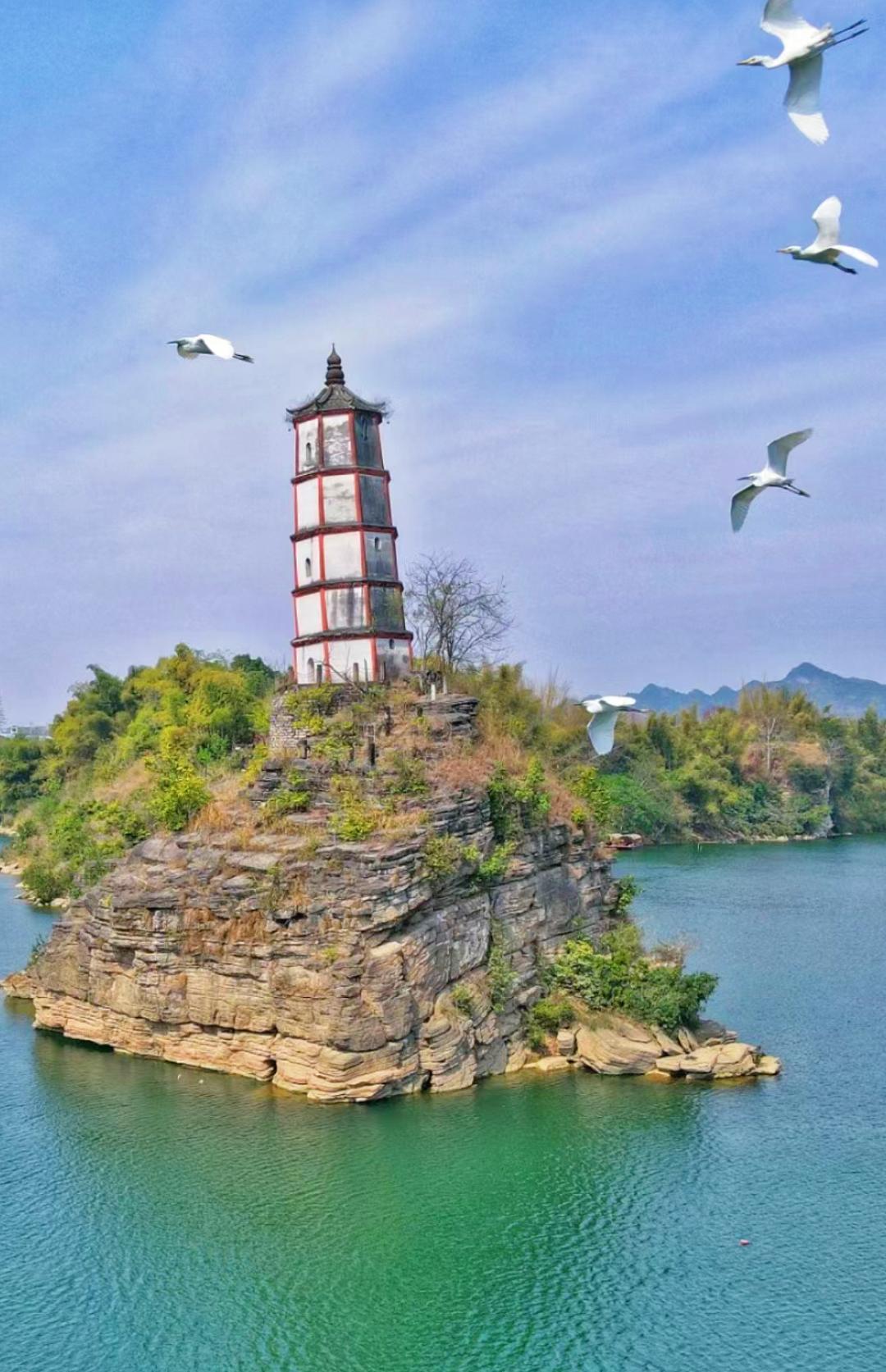 在景区内可以乘船观塔,也可以导航去「左江达村」那边,也可以拍到塔的全景。/太平古城/