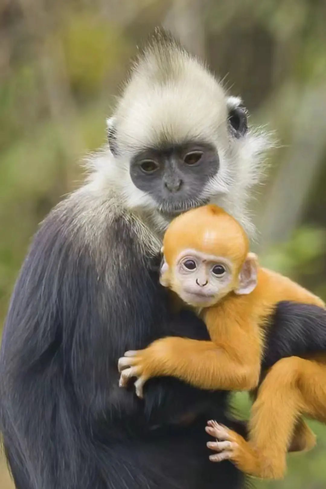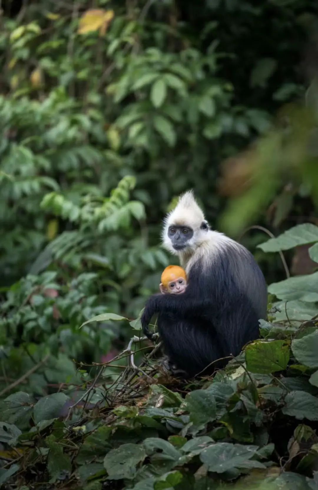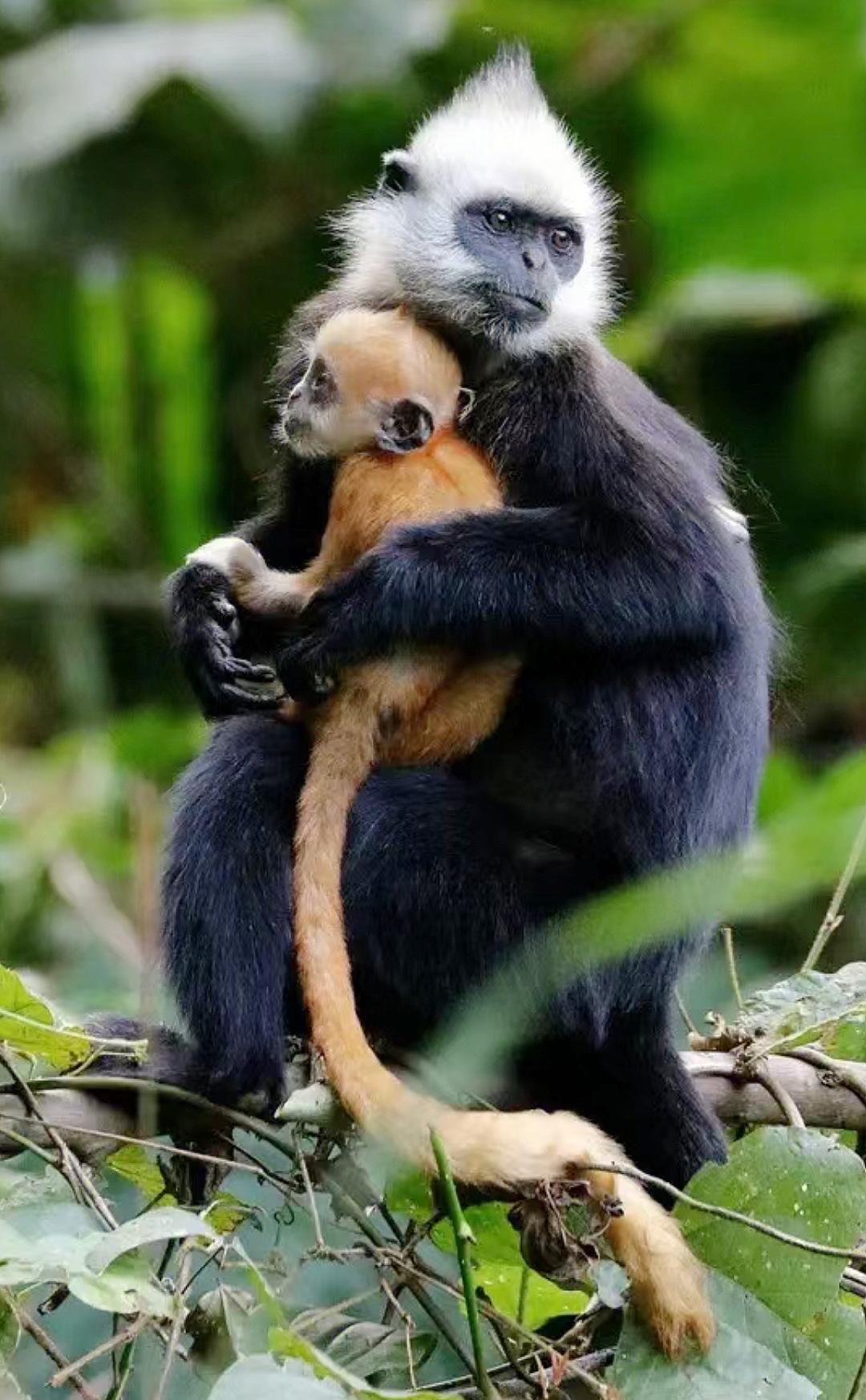 白叶猴特别好认,小猴是金色,长大之后会长成跟父母一样的深色,还会有“高颅顶”的白发,发型相当独特。