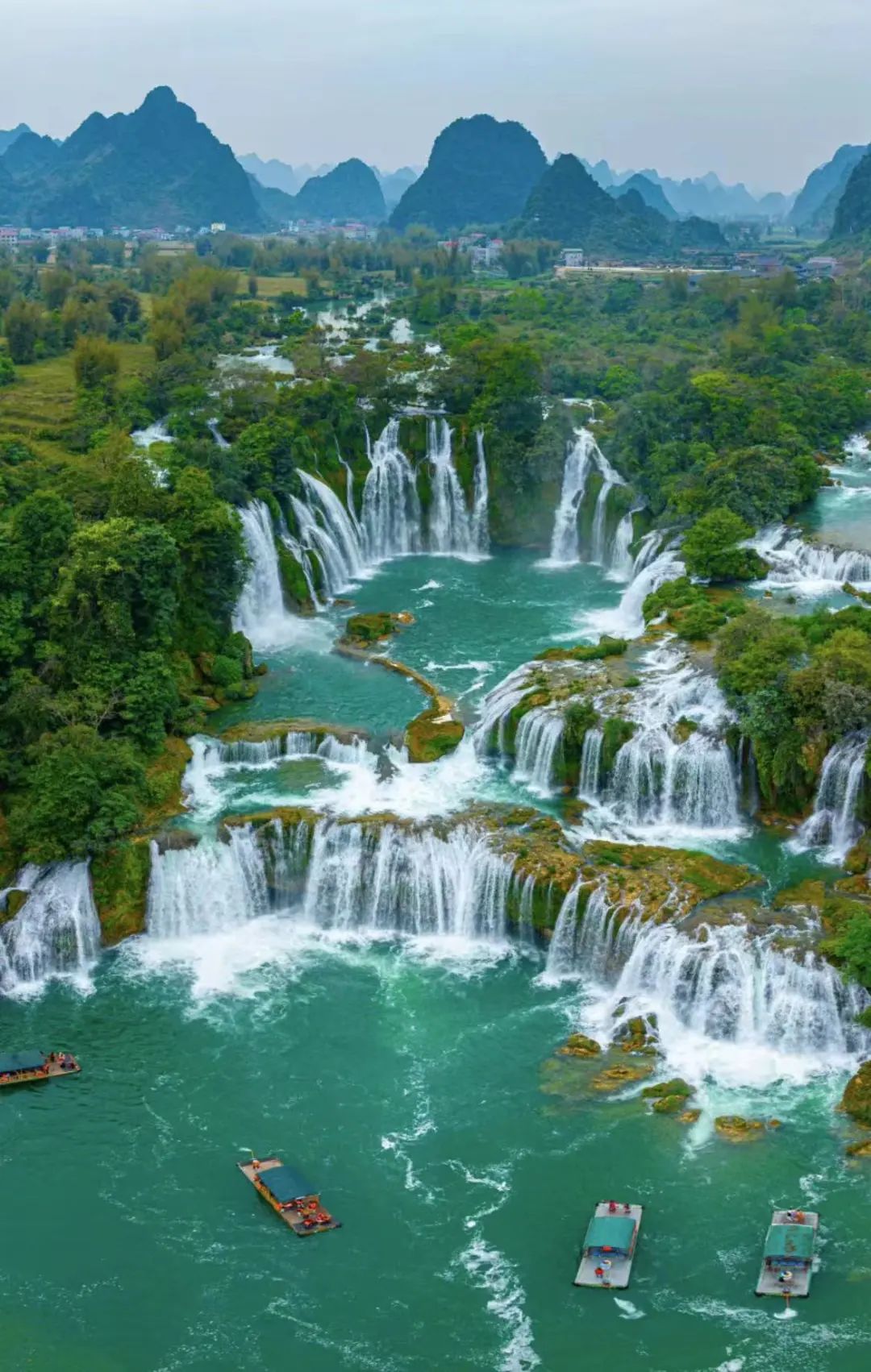 峡谷的尽头是偌大的跨境瀑布,古老的喀斯特地貌遥相辉映,青山环绕、翠竹婆娑,简直就是现实版的山水画。