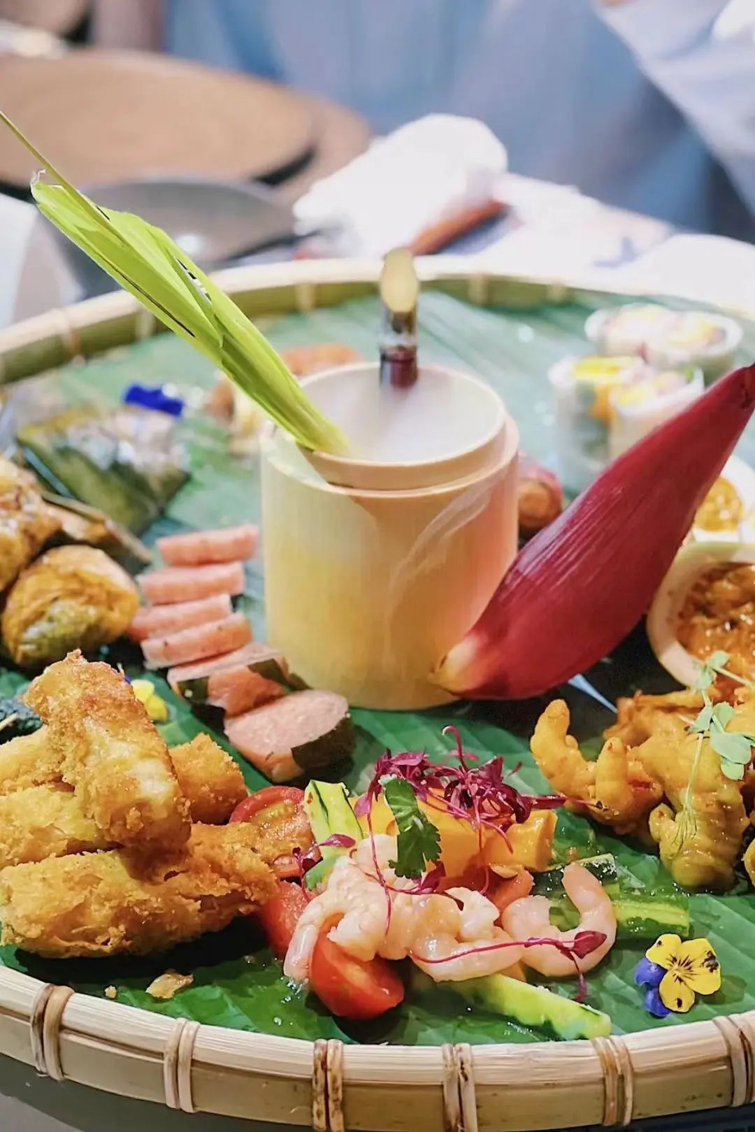 簸箕里面,打底的都是新鲜的芭蕉叶,端上桌的时候就能闻到清香。