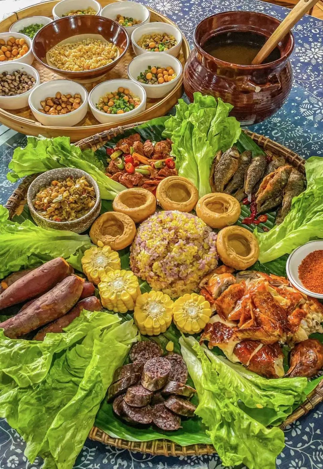 簸箕宴是传统的壮族美食,颜值高,而且菜品也多,跟傣族的孔雀宴大同小异。