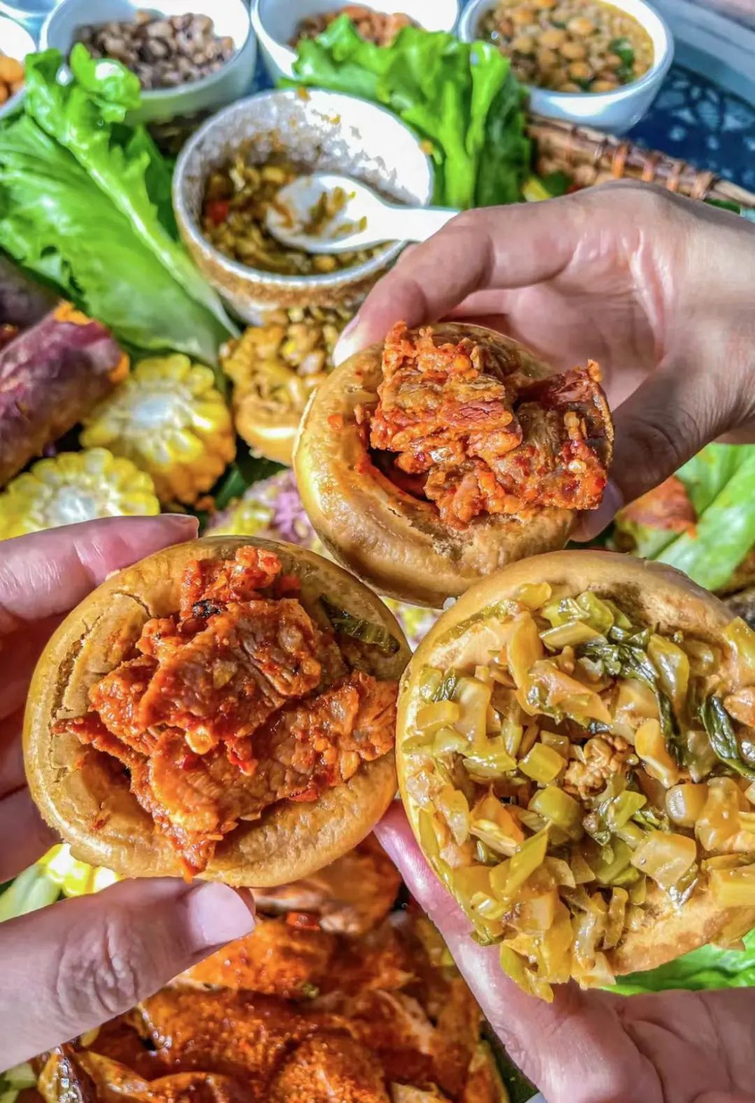 然后裹上肉沫和各种小菜,一入口,满嘴都是料,香得很。