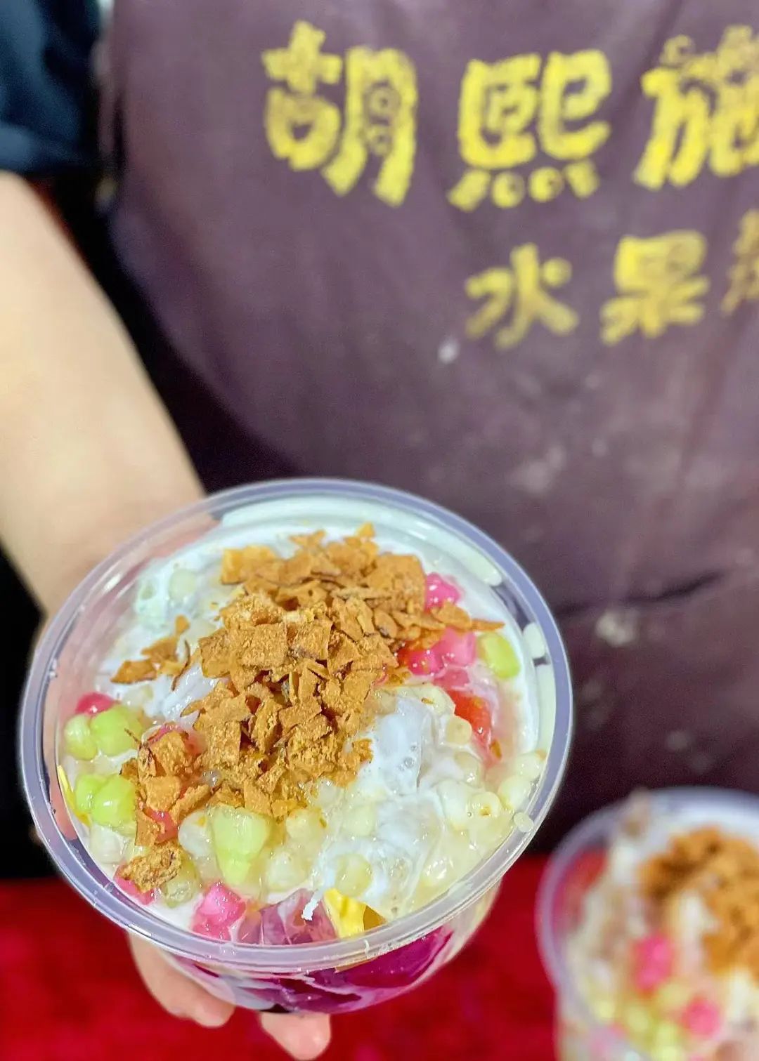 「胡熙施」是一家开了12年的越南水果捞店,满满一碗水果搭配上玉米羹和好几种配料,搅拌着吃口味很独特。