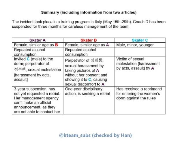 首先是两名花滑女运动员A和B集训期间酗酒,韩国冰协对此进行了调查,发现还有其他不当行为。据称,女选手A邀请了男选手C到她们的住处,并做出了让C感到不适的性行为,另一名女选手B则在未得到A同意的情况下拍摄了这一过程,并发给了C。