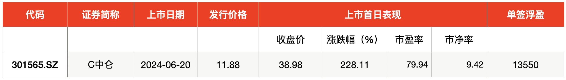 上周,中仑新材(301565.SZ)正式登陆创业板,上市首日,中仑新材开盘价为50元/股,涨幅为320.88%,截至收盘,中仑新材股价报收39.98元/股,涨幅为228.11%。按收盘价计算,投资者中一签浮盈13550元。