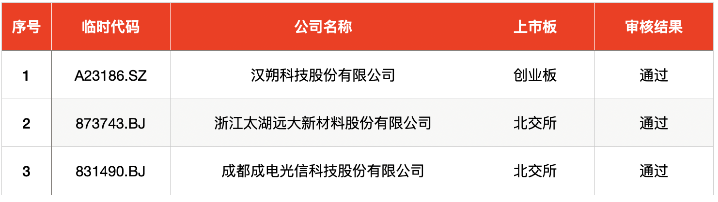 发审委审核方面,深交所在2024年第12次审议会议上,审议通过了汉朔科技股份有限公司首发上市申请;北交所上周举办两场审议会议,审议通过了成都成电光信科技股份有限公司(简称“成电光信”)、浙江太湖远大新材料股份有限公司(简称“太湖远大”)首发上市申请。