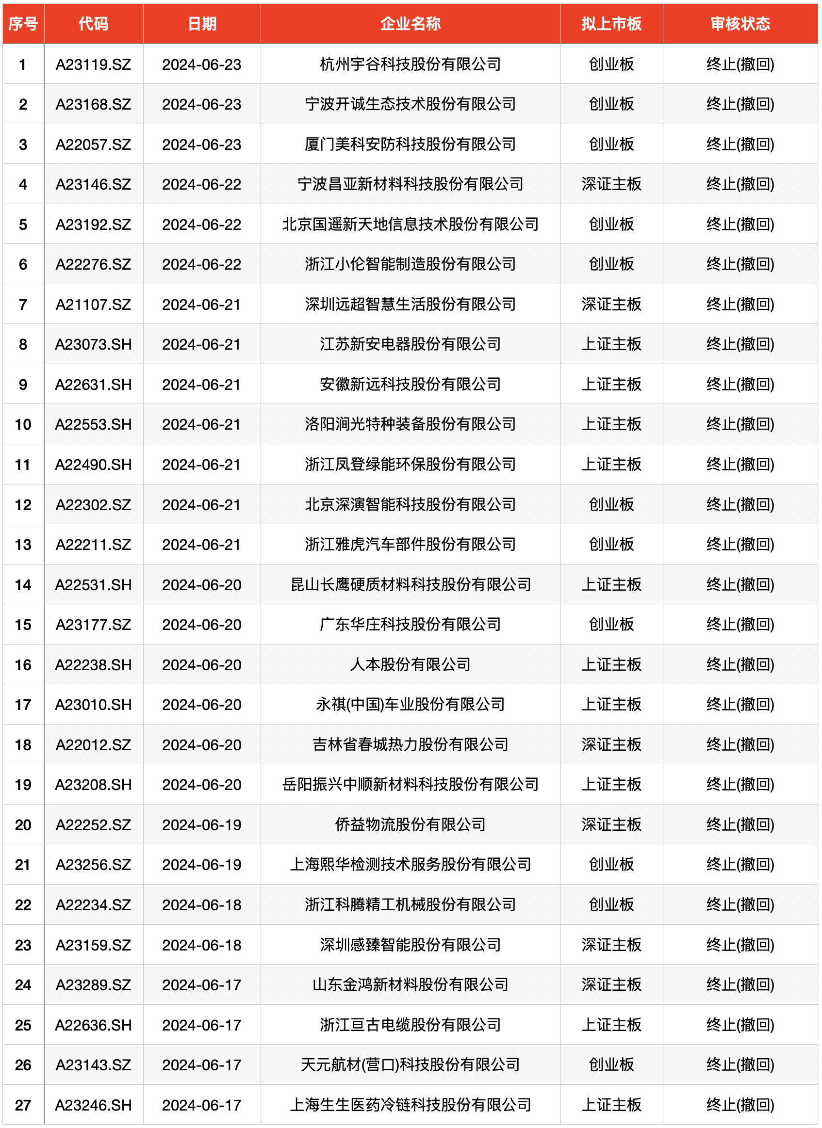 此外,上周,共有27家企业主动撤回IPO材料,刷新今年以来最高单周撤回纪录。