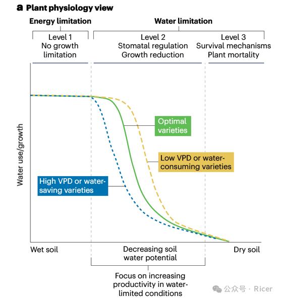 农业是最易受气候变化影响和最脆弱的行业之一。根据《2022年全球粮食危机报告》显示,在中非和南非地区,约有12个国家共4556千万人处于粮食匮乏状态,其中4个国家约631万人陷入由于全球气候变化引起的粮食问题。气候变化对粮食系统产生了多重影响,主要包括农业地理限制的变化、作物产量的变化以及对农业系统的冲击。在全球气候变化的背景下,保障粮食安全是一个全球性的挑战。我国是季风气候,雨水来自夏日里的海洋水汽蒸发,东南海洋季风年初在南方登岸,水汽凝结于陆地,在广东广西形成回南天。继续北上,在长江中下游与僵持的大陆冷空气僵持,形成长达一两个月的梅雨天气。直到七八月份,冷暖风团交锋的锋面移至华北大地,一年的主汛期开始降临。所以,华北平原每年的降水量四层出现在7月下旬和8月上旬,俗称“七下八上”。而这样的降水周期与农作物的生长很不匹配。而华北平原的冬小麦需水量高峰主要在3-4月,到6月基本完成收获。在收割后进行夏播,这意味着在春季和立夏降雨较少时需要通过大量人工灌溉补水。受全球气候变化影响,近年来降水异常,极端天气对夏收和夏播作物的后期生长以及收获造成负面影响。Vadez,V等人在《Nat Rev Earth Environ》发表了《中度干旱胁迫下作物的特性和产量影响》,提到进入2级干旱期间,作物通过减少生长以适应缺水环境。在3级期间,植物开始进入生存模式(图)。