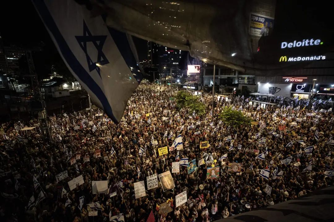 6月22日,以色列特拉维夫,大批以色列民众举行游行示威(澎湃影像)据美国“政客”新闻网23日报道,在过去的周末,以色列军队袭击了加沙北部加沙城包括一处难民营在内的的多个地方,累计造成超50人死亡。据加沙地带卫生部门统计,自去年10月7日以来,以军在加沙地带的军事行动已导致37551名巴勒斯坦人死亡、85911人受伤。