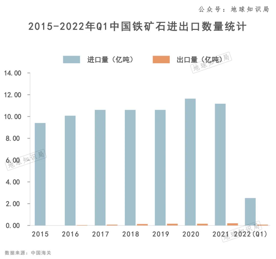 根据2021年中国矿产资源报告,中国铁矿石表观消费量(国内产量+净进口量)为14.2亿吨。2021年全年,中国累计进口铁矿石11.24亿吨,进口额高达1.2万亿元,占中国总进口额的7%。中国的铁矿石进口量巨大,而且还有上升的趋势▼