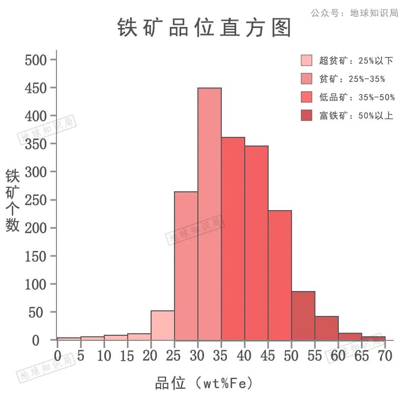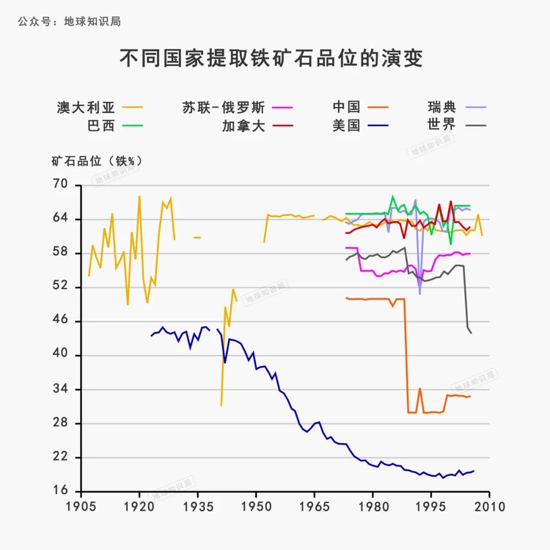 世界各国铁矿石品位差异较大,巴西、俄罗斯、澳大利亚等国富铁矿居多,铁矿石的品位高,均在50%以上,开采价值大;而以中国、乌克兰、美国为代表的铁矿品位低,有的甚至不具备开采的经济价值。二战后铁矿石需求增加,加上美国高品位赤铁矿的枯竭