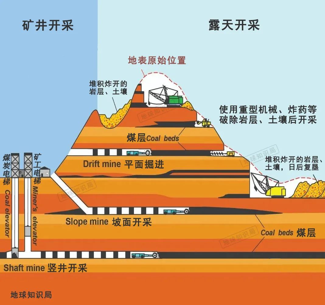 而开采难度取决于开采方式。现有的开采方式有露天开采和矿井开采两种。