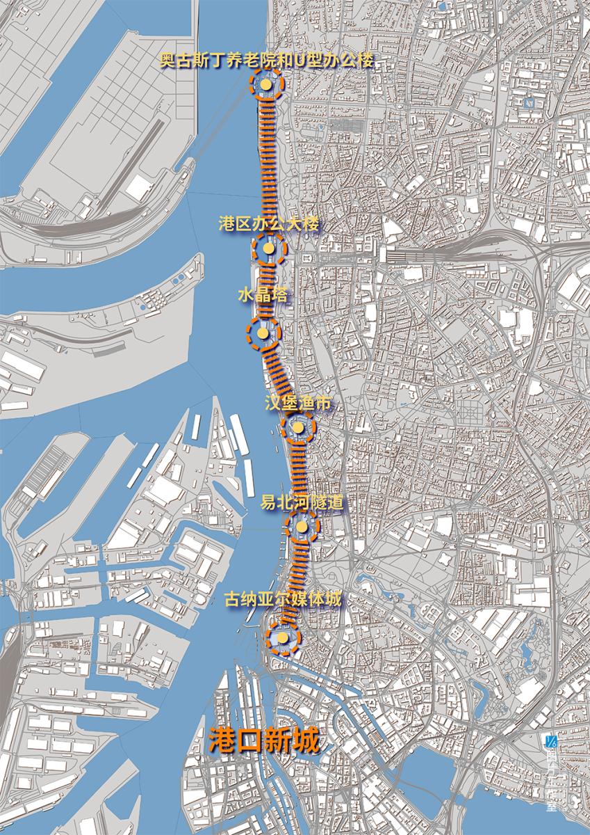 从最西侧由冷库改建的奥古斯丁养老院(1993),穿过5位投资人合资开发的5栋U型独栋办公楼(2000),到获奖无数的港区办公大楼(2005),再到木材码头上地标建筑的水晶大厦(2011),止于欧洲最大杂志社所在的古纳亚尔媒体城(1990)。1987年至今,「珍珠项链」计划让易北河北岸焕然一新。▼