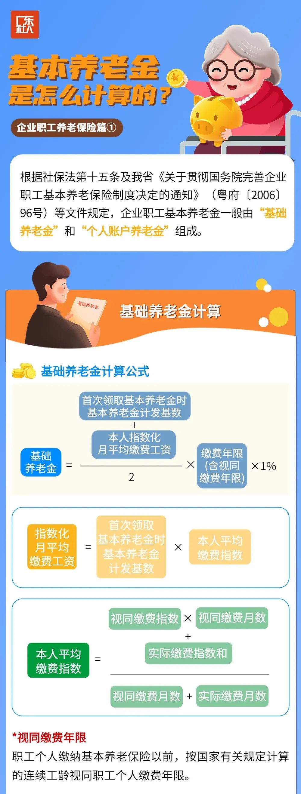 另外还需说明的是,除了基础养老金和个人账户养老金两个项目是人人都有外,还有部分参保人可享受过渡性养老金权益和地方养老金权益,关于这两种基本养老金项目的计发办法规定在《关于贯彻国务院完善企业职工基本养老保险制度决定的通知》(粤府〔2006〕96号)和《广东省人民政府关于完善企业职工基本养老保险过渡性养老金计发办法等事项的通知》(粤府函〔2021〕294号)等文件中,大家可自行参阅哦!