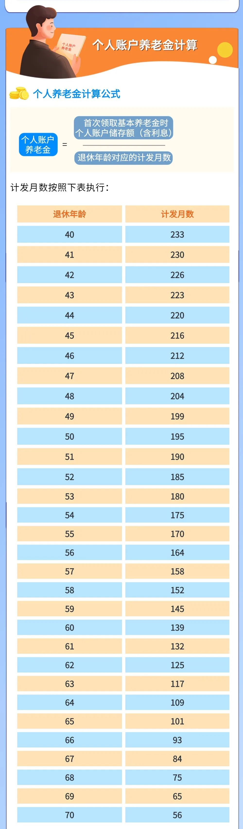 ■ 个人账户养老金=退休时个人账户累计储存额÷退休年龄对应的计发月数=200000/139=1438.85元