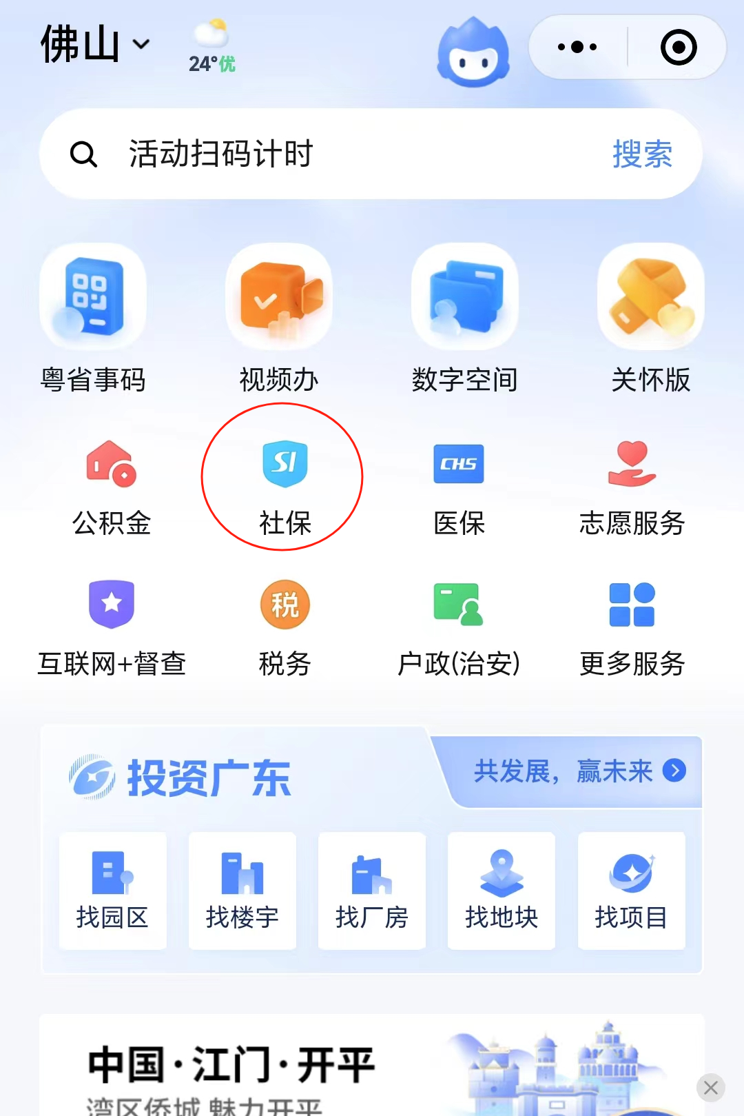 一、扫码进入“粤省事”微信小程序首页。