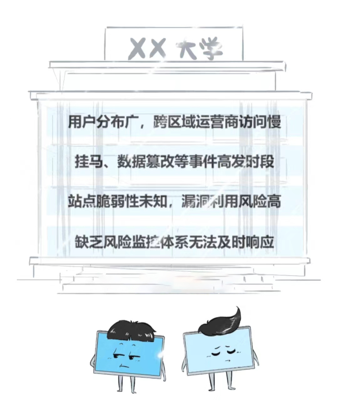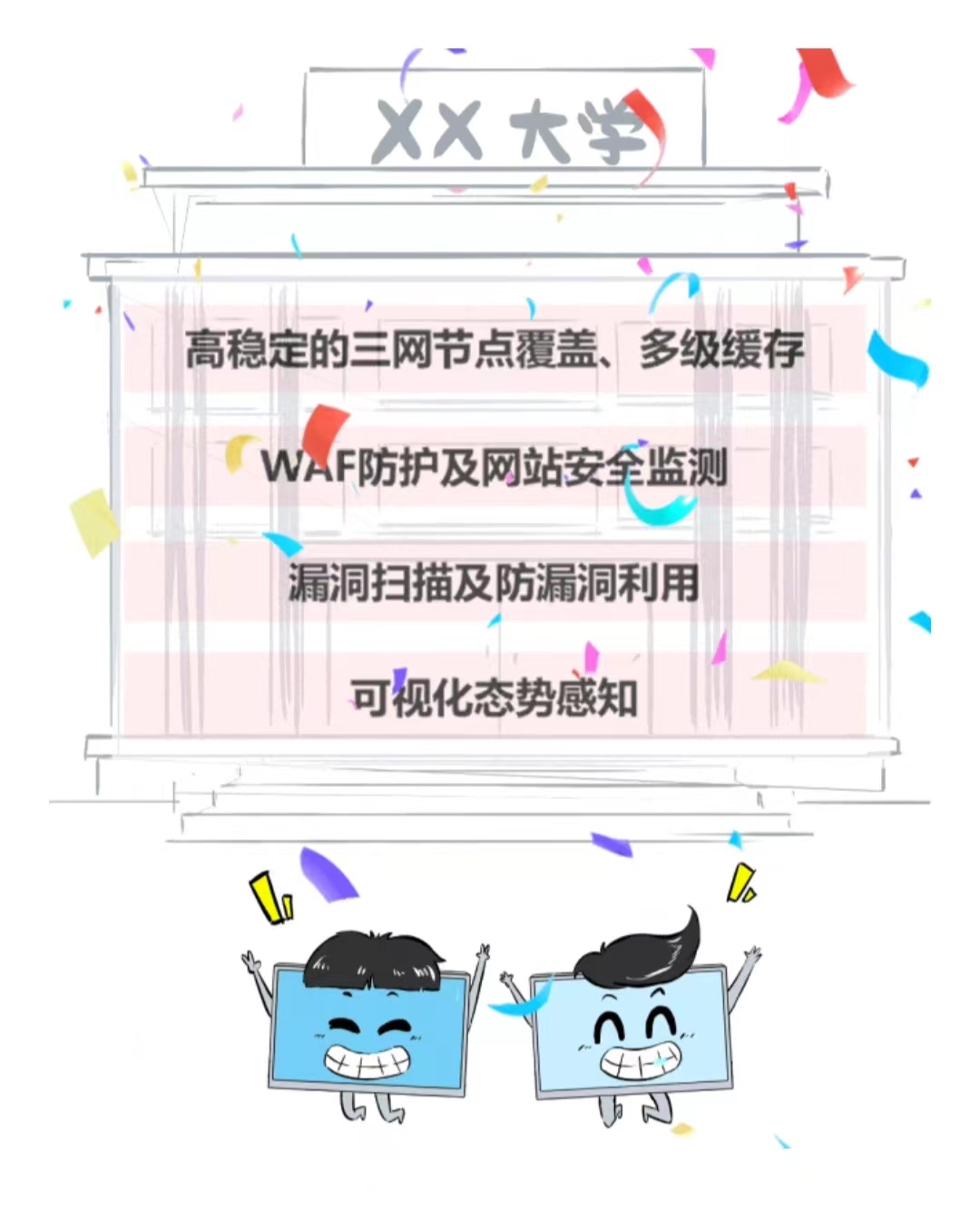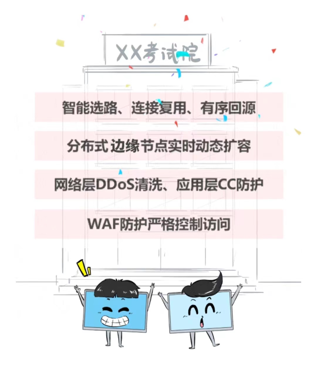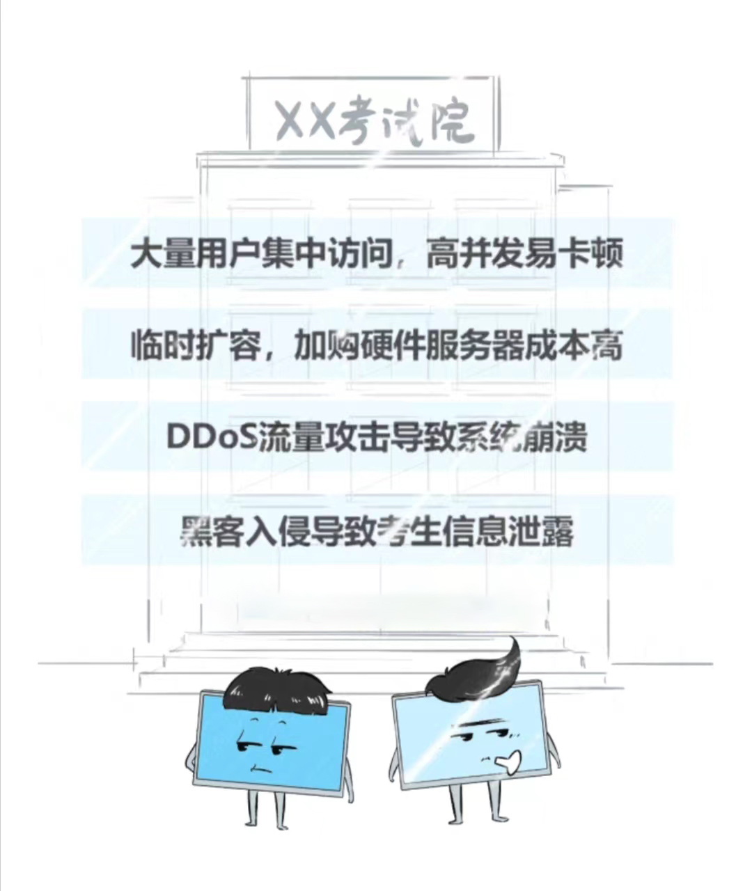 ❷安全防护:网站兄弟主要面对两类安全威胁,一类是DDoS攻击(DDoS指分布式拒绝服务攻击),尤其卡在志愿填报截止前,用CC攻击(拒绝服务攻击)或者Flood攻击(大量流量的洪水攻击),让服务器资源或者带宽耗尽。