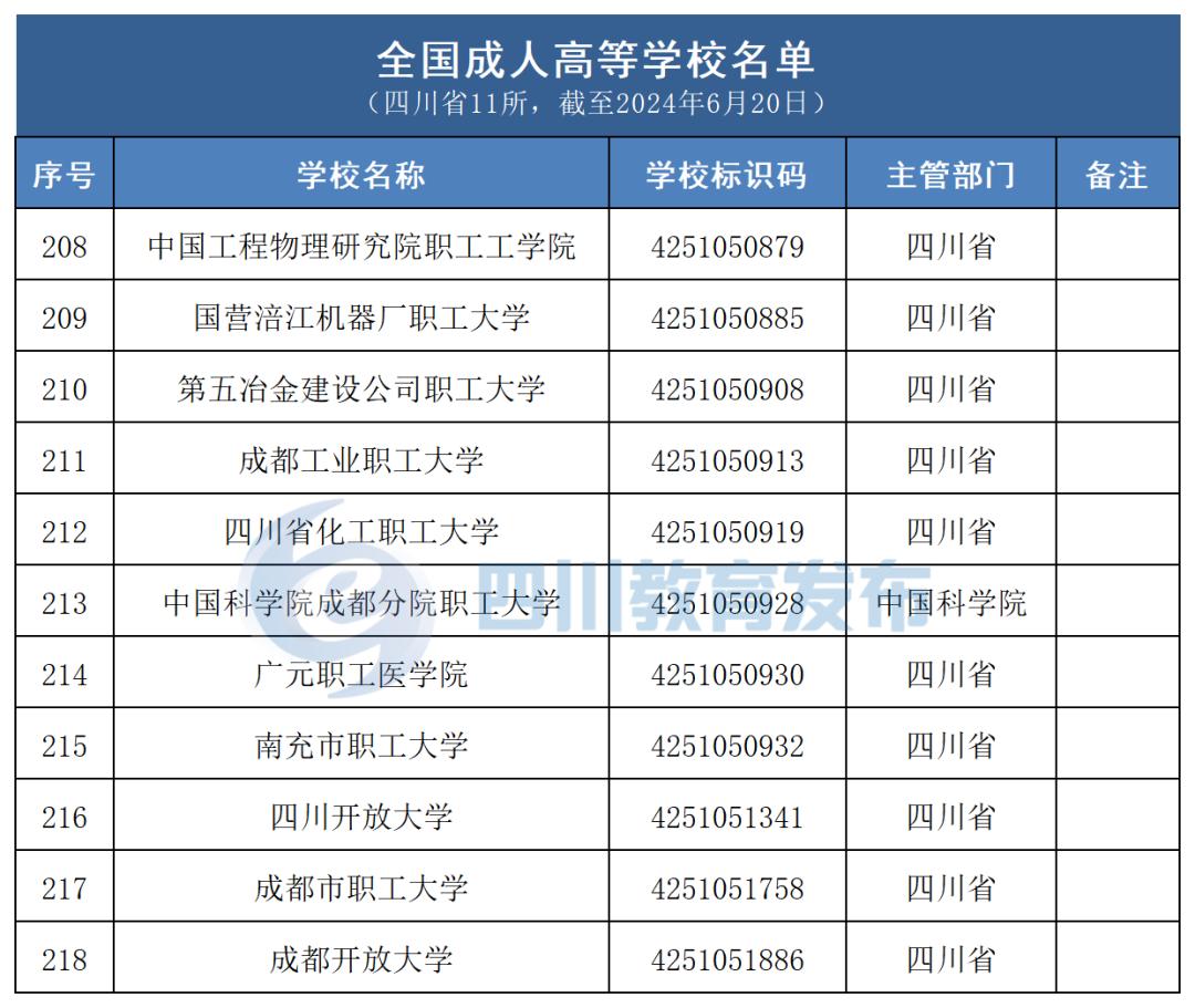 截至2024年6月20日,全国高等学校共计3117所,其中:普通高等学校2868所(四川省共139所),含本科学校1308所、高职(专科)学校1560所;成人高等学校249所(四川省共11所)。本名单未包含港澳台地区高等学校。