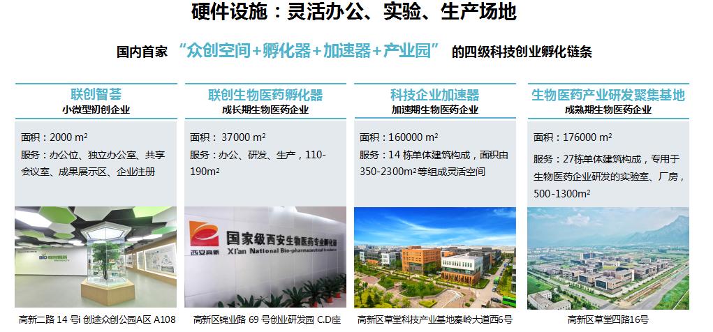 西安联创生物医药孵化器西安联创生物医药孵化器有限公司成立于2005年,通过搭建生物医药公共技术平台、医疗器械概念验证中心、科技教育人才创新联合体、科技成果转化服务、孵化空间载体建设等形式持续推进专业化孵化服务体系建设和实施,打造了生物医药领域“产、学、研、医、管、金”相结合的众创生态平台。形成了完善的四级孵化服务链条(即”众创空间+孵化器+加速器+产业园“孵化链条),分别服务于生物医药创新创业的“团队期-初创期-成长期-发展期”四个成长阶段。