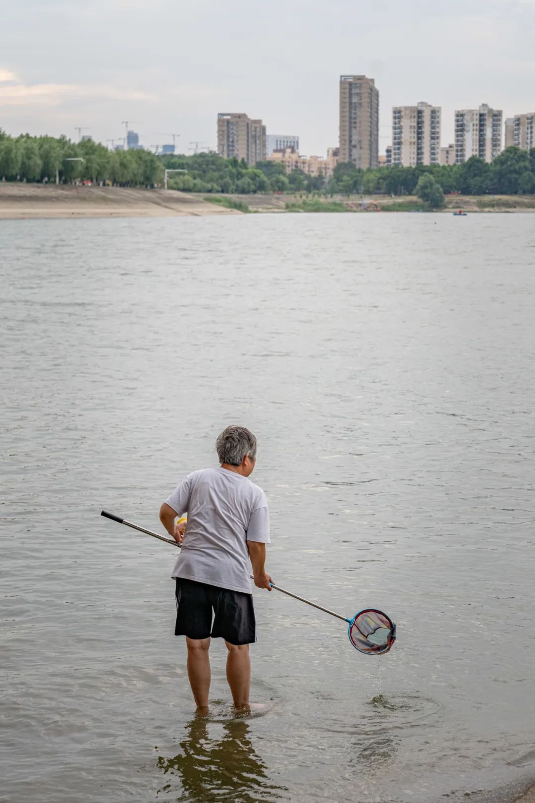 奶奶手拿一根长长的捞鱼网,耐心地在江边游走,想为小朋友逮住一只活蹦乱跳的宠物。