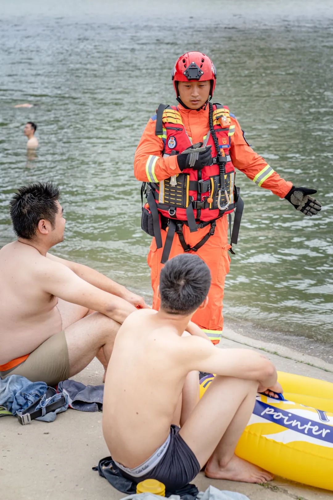 |亮灯的消防巡逻车学游泳的小朋友玩累了,和爷爷坐在岸边休息,他盯着穿着专业救生衣的消防员们,大大的眼睛闪烁着好奇。
