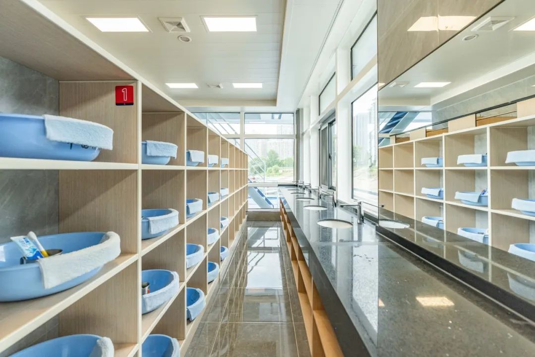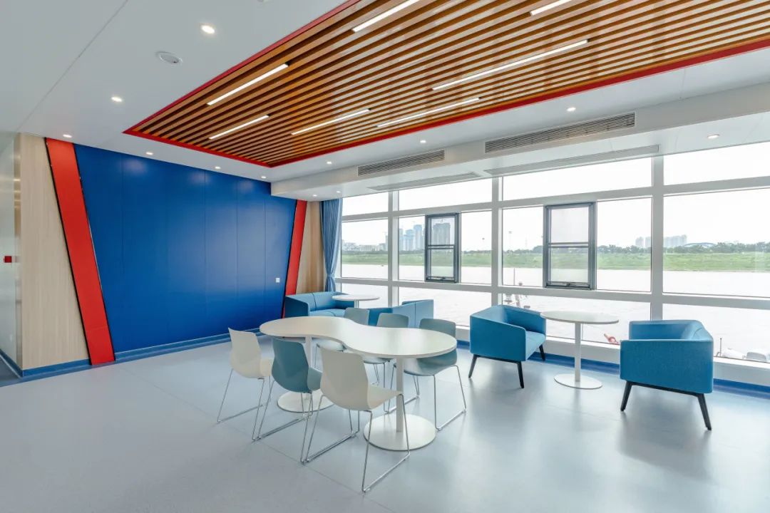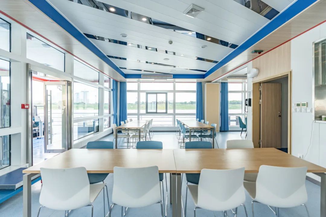 |能看到江景的餐厅上层就更加丰富了,除了宿舍,还有沐浴间、会议室、办公室、图书阅览室、共享活动空间等区域。