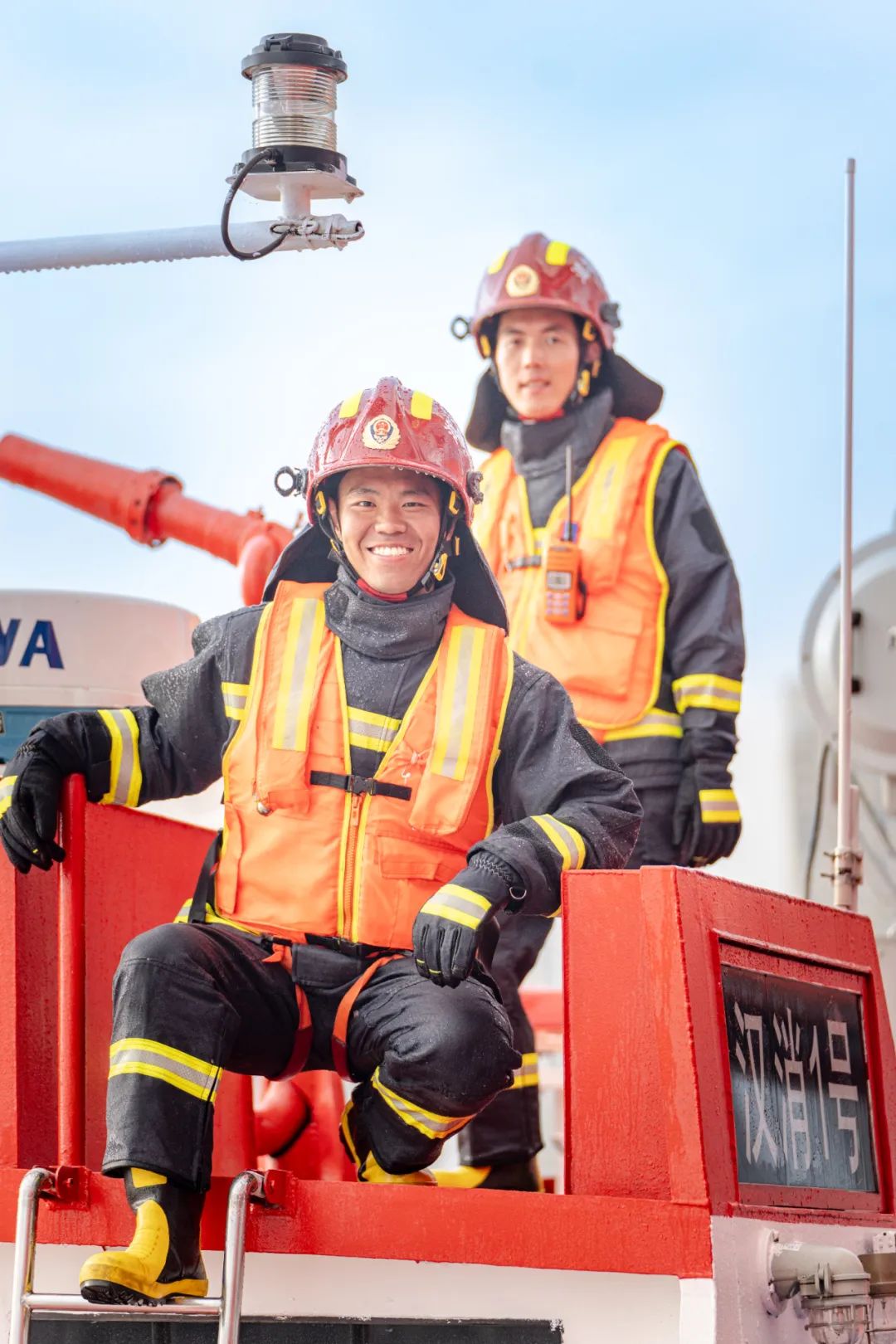 |穿着专业救生衣的消防员们队员们穿着厚重,还戴着头盔,身上脸上早就浸透了汗水,但那一刻他们很有默契地相视一笑。