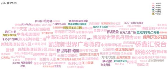 对在售二手房每平米单价最高的前100个小区进行词云可视化。