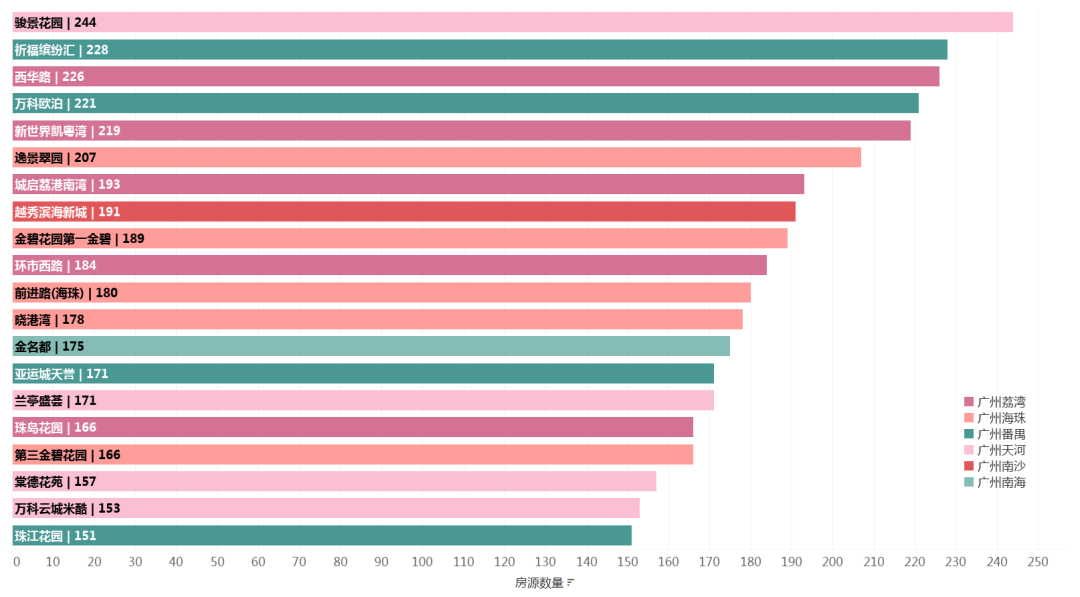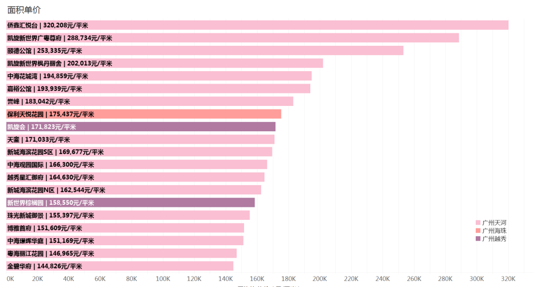 对各个小区在售二手房每平米单价数据进行排序,排名前20的小区均主要位于天河区、越秀区和海珠区。