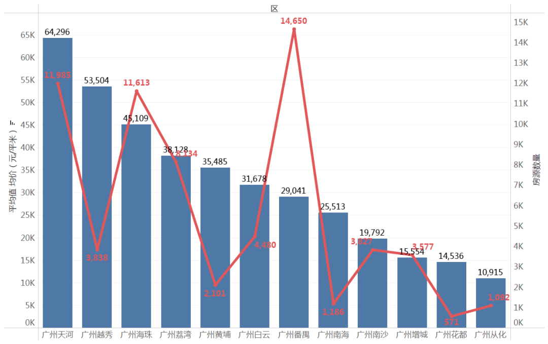 将各小区数据按照每平米单价进行降序排列,用柱图显示。房源数量数据用红色折线图表示。
