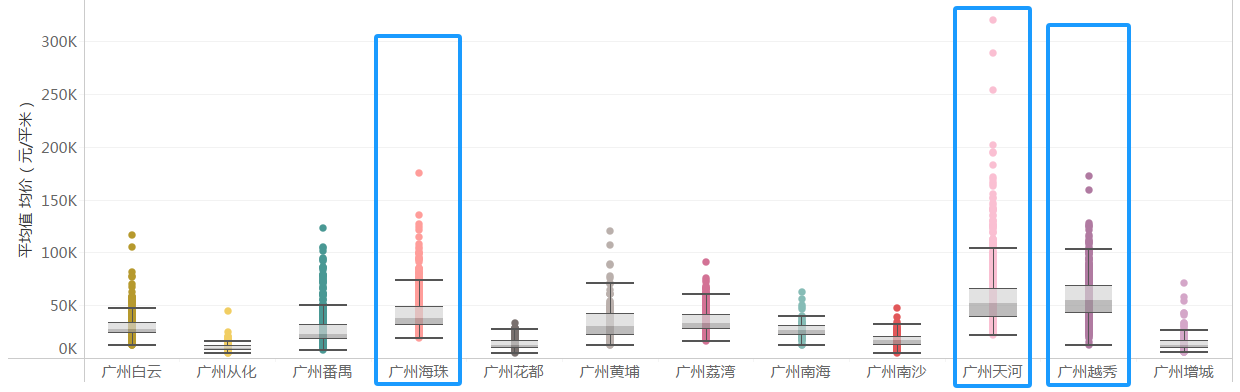 从盒须图中也可以看出天河区、越秀区、海珠区房价明显高于其他区。