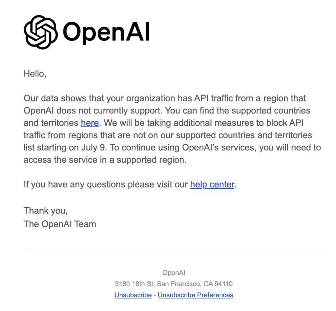 OpenAI 在检测用户使用其 API 的地区后,提示所有不支持位置的用户:即将封禁「非法」流量,截止日期定在 7 月 9 日。这次警告的范围很大,有一些位置在服务范围内国家的用户也报告说收到了该邮件。
