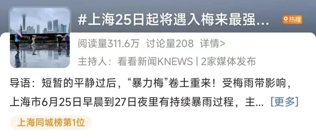 从昨晚开始,#上海25日起将遇入梅来最强暴雨#持续霸榜上海同城热搜。