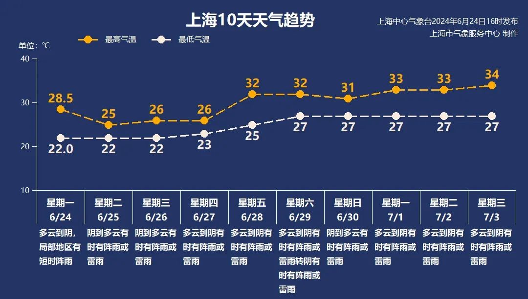 此外申城25日夜里到27日大气不稳定、能量高,雷雨时局部地区阵风可达7~9级。受强降水影响,25-27日最高气温回落到25~26℃,体感较为清凉。28日起,气温迅速回弹至30℃以上。