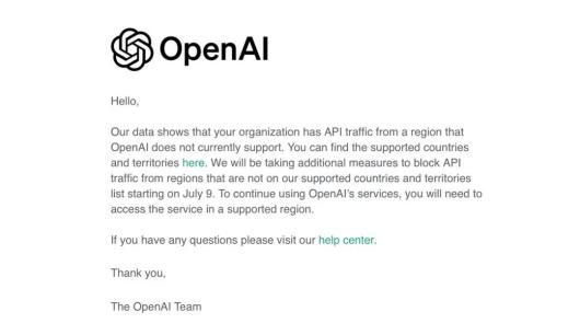 从昨晚至今日(6月25日),有多名开发者在社交媒体上称,收到了来自了来自OpenAI的邮件。OpenAI在邮件中表示,“我们的数据显示,您的组织存在来自OpenAI目前不支持的地区的API流量。”邮件进一步称,“我们将从7月9日起采取额外措施,阻止来自不在支持国家和地区列表中的地区的API流量。若要继续使用OpenAI的服务,您需要在支持的地区访问该服务。”