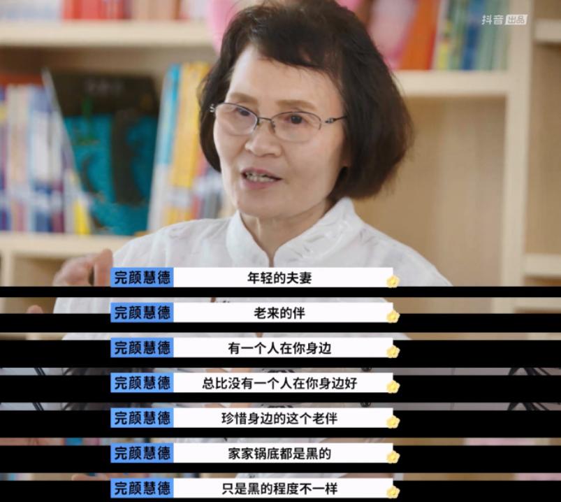 「年轻的夫妻老来得伴,有一个人在你身边总比没有一个人在你身边好。珍惜身边的这个老伴,家家锅底都是黑的,只是黑的程度不一样。」