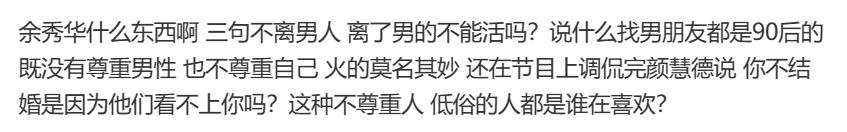 还有更多的,执着于批判嘉宾的女性意识。按发言内容给俩人打上了「先进」「落后」标签进行对比审判。