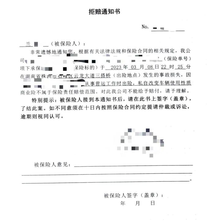 保险公司根据“新能源汽车商业保险示范条款(试行)免责事项说明书”第十条第三款,认为“因驾驶员周某驾驶涉案车辆从事营运工作时出险,私自改变车辆使用性质”,向兰某发出“拒赔通知书”。兰某遂将该财产保险公司起诉至湖南省株洲市渌口区人民法院。