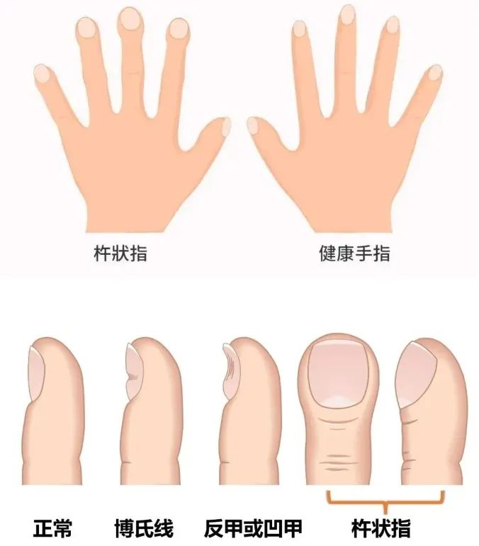 杵状指,又叫鼓槌指,指的是手指和脚趾末端组织出现增生、肿胀,导致的指头变形、增大,手指头末端一般会像小鼓槌一样,指甲近端与甲根软组织的基底角往往≥180°,一般不会有疼痛感。