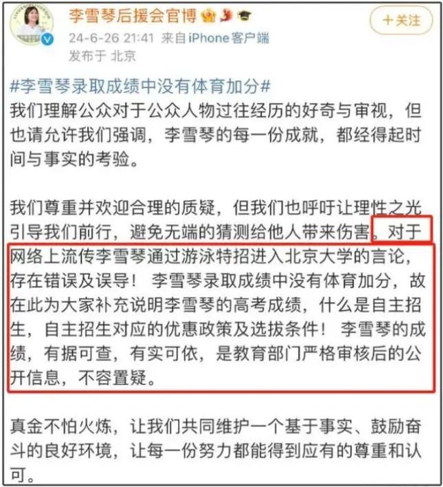 6月26日晚,@李雪琴后援会官博 也发文强调李雪琴录取成绩中没有体育加分。“我们理解公众对于公众人物过往经历的好奇与审视,但也请允许我们强调,李雪琴的每一份成就,都经得起时间与事实的考验”