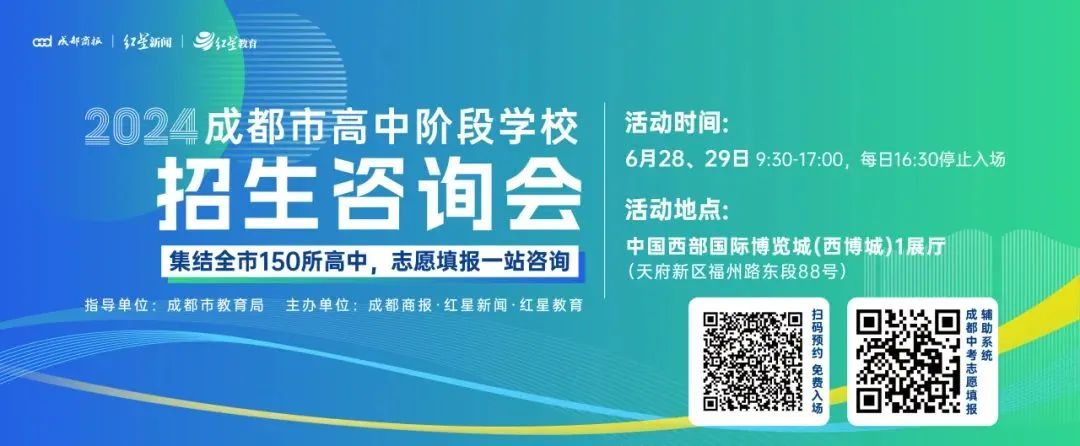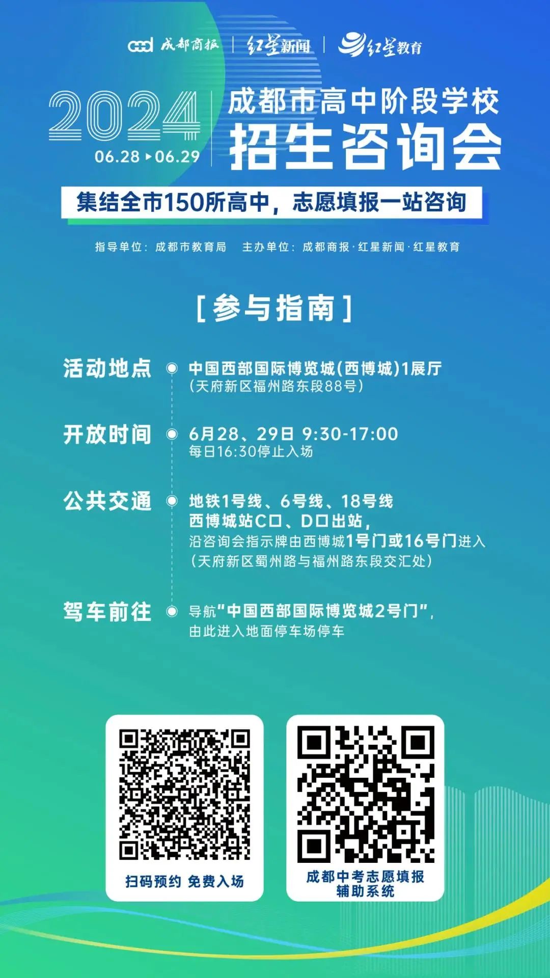 ▸ 活动不售门票,全程公益免费· 预约6月28日各时段,家长须凭2024年成都中考考生准考证号,及家长身份证号进行预约,一个准考证号可绑定预约多位家长,每位家长均须预约入场。