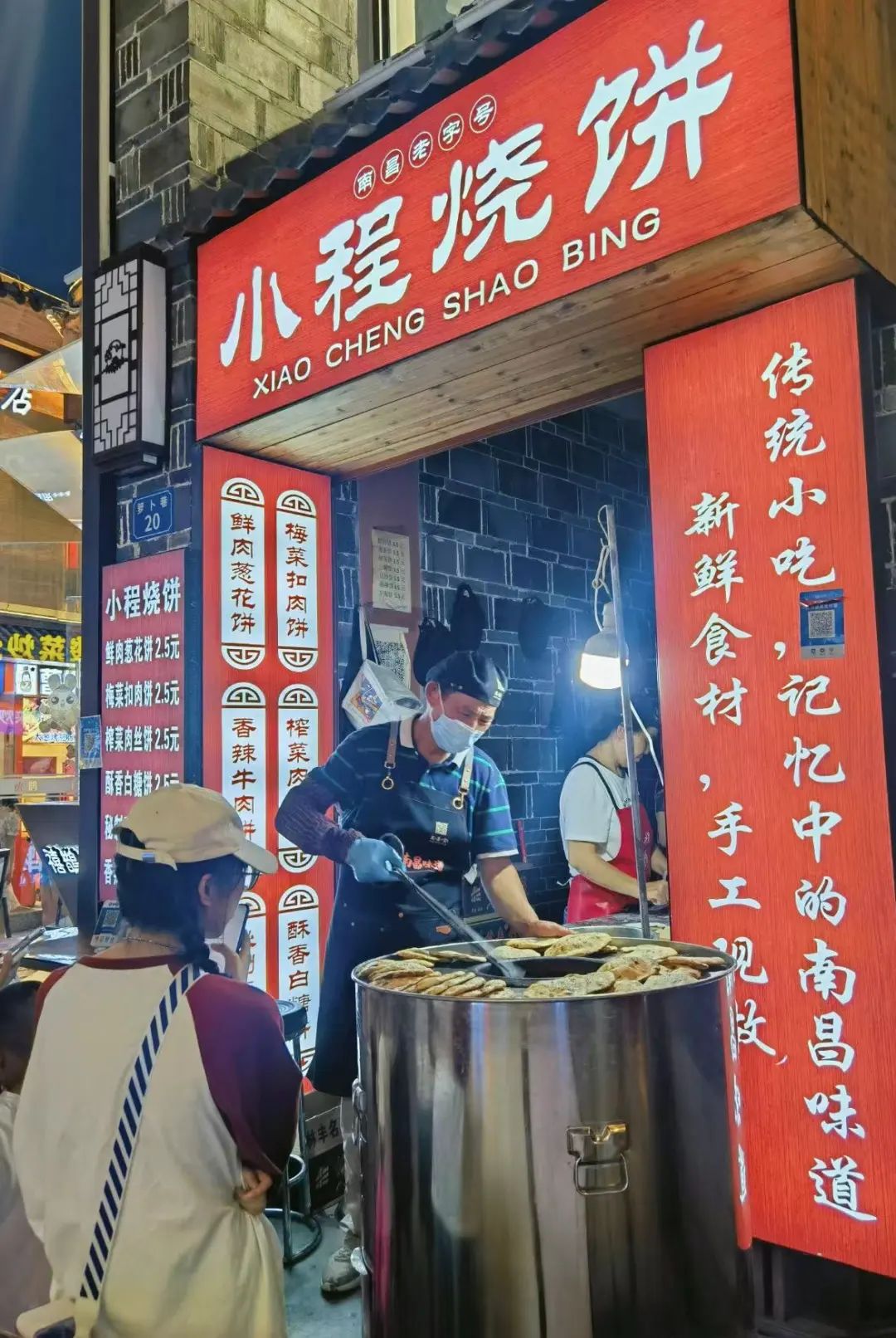 两家旗鼓相当的烧饼小店。红歌是上过南昌电视台的,10块钱6个,馅料很足,盲选梅干菜的不会踩雷。