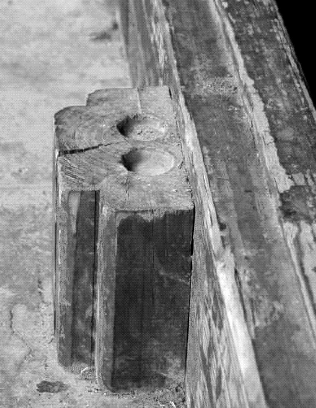 穿,是木构架柱子之间上方的矩形横档,也可称横穿,另有一种名羊角穿,以其形似命名。(图60—图62)两根柱子之间有2根或3根穿,将柱子连接起来组成帖。穿,建筑术语称之为穿枋。