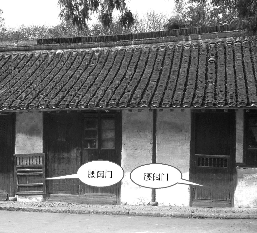 图71 一门一窗柦也有在大门前再装上腰闼门的。腰闼门,高度仅为大门的一半。(图72)主要作用是大门开启后,可防止幼儿在家长不知情时走出大门,以及外面鸡鸭进到屋里来,还可增加采光。腰闼门可以装在前埭房子大门上,其他如厢房等门上也可加装。