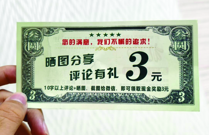 值得注意的是,部分消费者在外卖餐点中偶尔会发现一种“好评返现卡”。“我曾多次在外卖包装袋里发现这些小卡片,上面一般会写着‘晒图分享评论即可领取3元现金’等内容。”打卡爱好者季帅指出,这种情况不给打五星审核是不给返现的,“有一次因为菜品不好吃,我给打了四星截图给商家后,他们表示,真实评价就是要‘给五星’,不可能花钱买四星的。”
