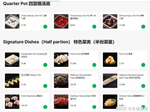 在日本Uber Eats外卖平台上,海底捞菜品虽和新加坡基本一致,但又有细微差别。如锅底中增加了清油麻辣锅底,比新加坡多1种;蔬菜和豆制品仅有3类,比新加坡少5类。